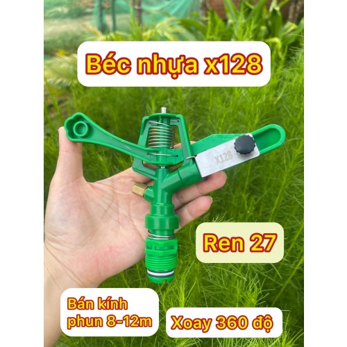 Béc X128 là dòng béc tưới phun mưa, bằng nhựa, xoay tròn 360 độ, bán kính 14-16 mét mỗi lần tưới phủ diện tích rộng 800m2.